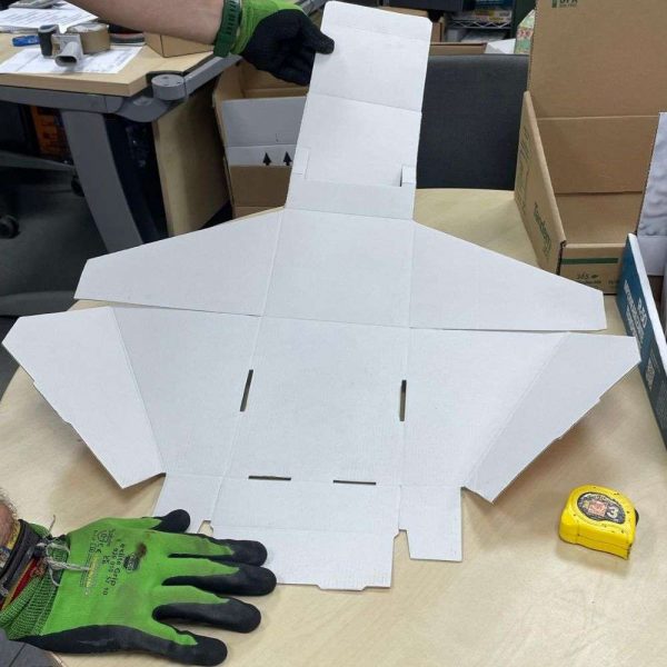 “Antes llevaba una ala, pero ahora está cortada para facilitar su montaje. Cuando llega al lineal, se arranca esta parte y el expositor queda listo para su uso.” – Explicación del proceso de montaje