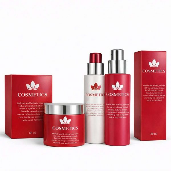 Tarros de crema, envases de vidrio o plástico, fórmulas cosméticas de cuidado facial o corporal.