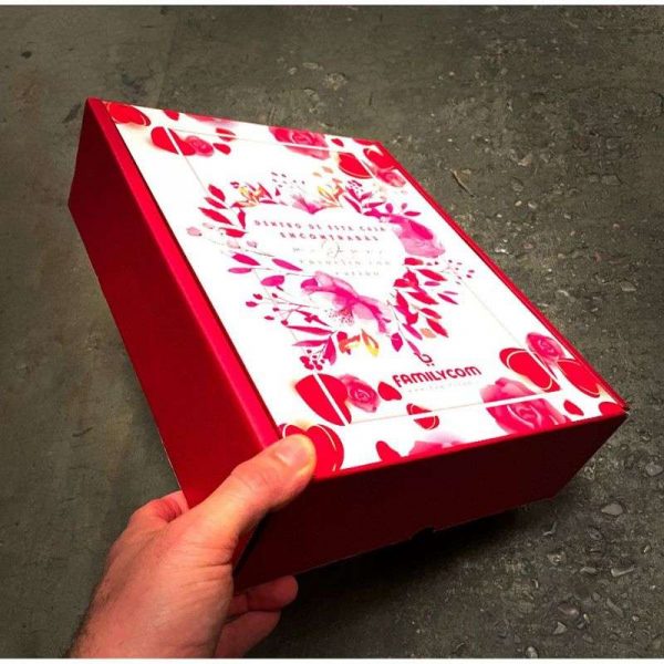 Uno de nuestros proyectos recientes fue la fabricación de una serie de cajas personalizadas 25x35x10 para la empresa Familycom. Se trataba de una caja automontable con exterior rojo impreso y un interior blanco natural, diseñada con impresión offset para asegurar una fidelidad total en el diseño gráfico.